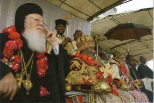 In der Bildmitte das Oberhaupt der Äthiopischen Orthodoxen Kirche, Patriarch Abune Paulos (mit Mitra), links im Bild der Ökumenische Patriarch von Konstantinopel als ranghöchster Vertreter der getrennten byzantinischen Orthodoxie.