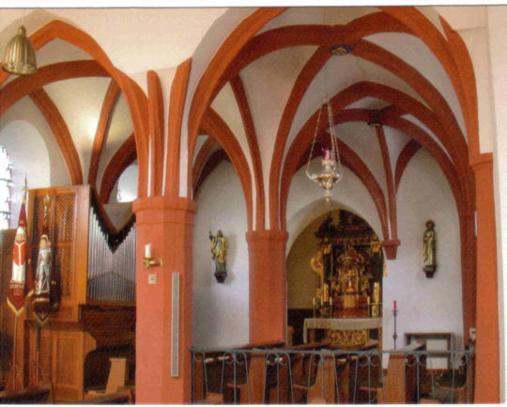 Diese Karte von 2008 zeigt den jetzigen Zustand der spätgotischen Chorturmkirche von 1500. Sie ist eine typische Trinitarierkirche mit ursprünglich drei Mittelstützen, die die Halle in zwei gleich große und gleich hohe Kirchenschiffe teilen. Der Altar befindet sich im Erdgeschoss des Ostturms der Kirche. Dieser wird daher Chorturm und folglich der Bautyp der Kirche Chorturmkirche genannt.