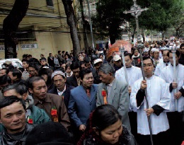 „Seit dem vergangenen 18. Dezember versammeln sich jeden Tag 2.000 bis 5.000 Katholiken auf dem Gelände des Bischofssitzes in Hanoi, um für die Rückgabe der Nuntiaturräumlichkeiten zu beten. Ich benütze bewusst das Wort ´beten´, wie dies vorsichtshalber auch die Katholiken in Vietnam tun. Denn Proteste oder Demonstrationen sind in Vietnam nicht erlaubt. Die Kirche hat bei der genannten Versammlung auf kirchliche m Boden nur eine Genehmigung für Gebetszwecke von der Regierung erhalten.”
