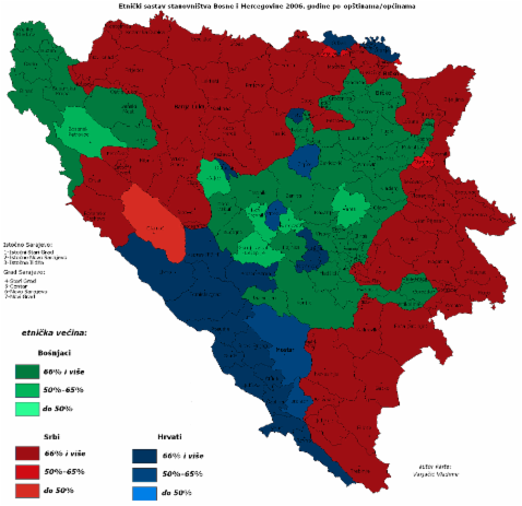 Die Karte von Vladimir Varjacic zeigt die ethnisch-religiöse Verteilung in Bosnien-Herzegowina im Jahr 2006 (Blau: katholische Kroaten, Rot: orthodoxe Serben, Grün: moslemische Bosniaken). Text: Giuseppe Nardi; Bild: Vladimir Varjacic (Katholisches.info, 25.01.2012).